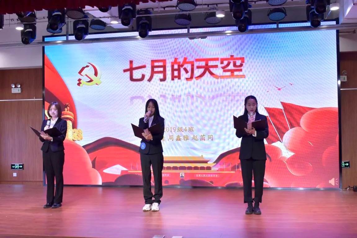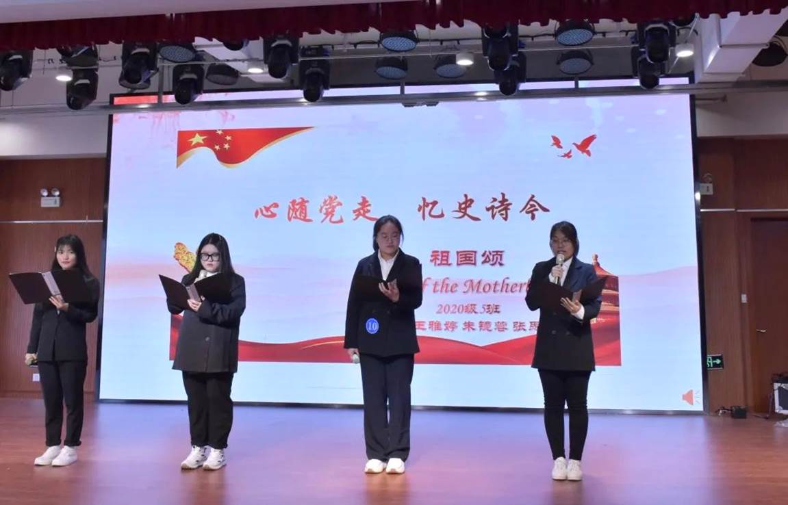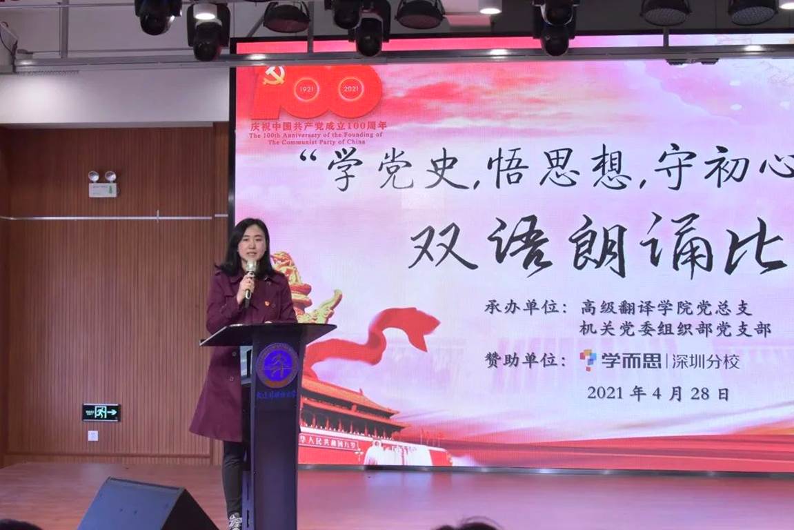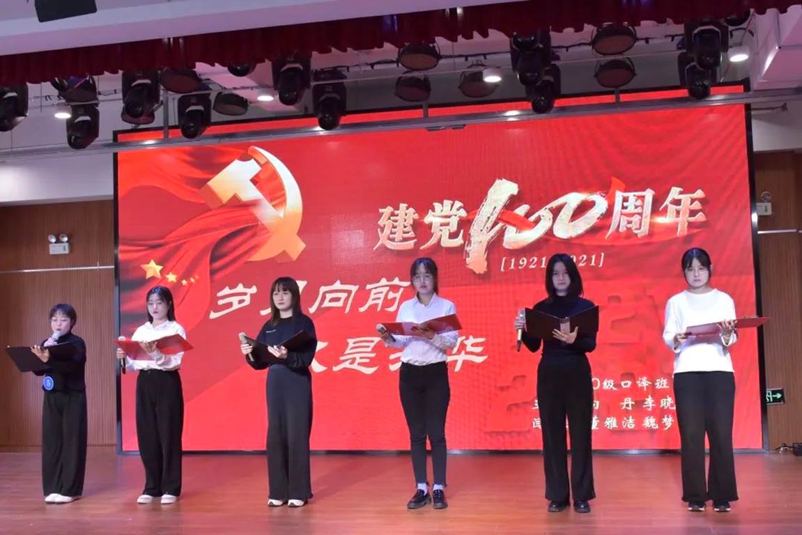 的专业特色,更加强了同学们翻译能力与党史知识的掌握。参赛选手用饱满的语音以及真挚的情感博得现场同学们的群情振奋和豪情满怀。声声入心,激奋昂扬,高亢的朗诵声中传递着高翻学子对于历史的传承,对于中国共产党的忠诚以及对于祖国的热爱。