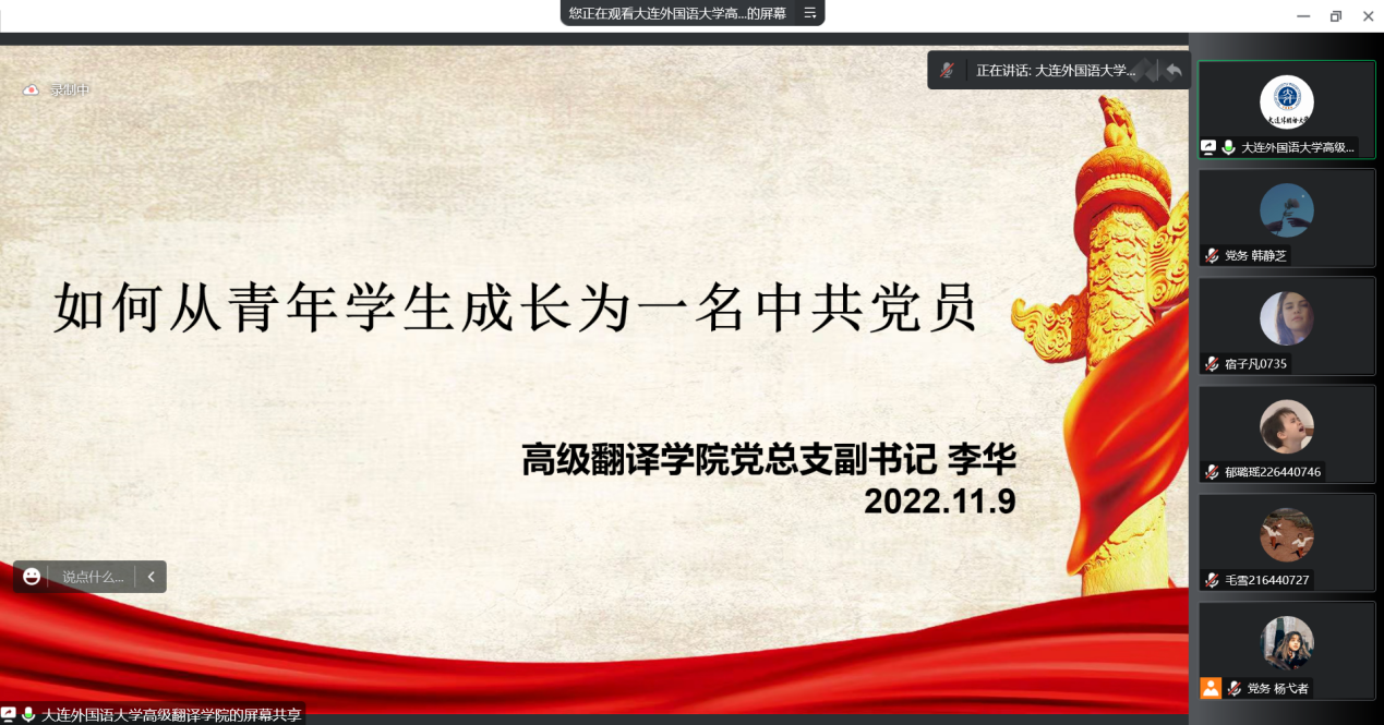 于励业楼502教室以线上线下相结合的形式召开主题为“如何成长为一名合格的共产党员”的入党积极分子党课第四讲,本次党课由六色网