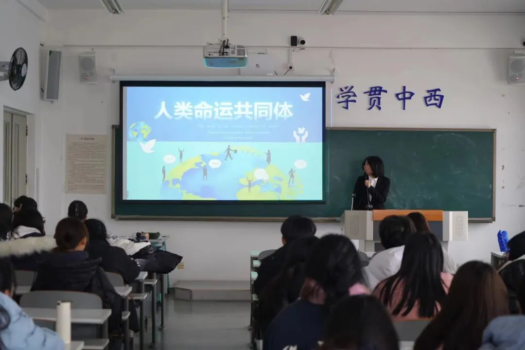 活动开始,宣讲团成员杨佳玟同学以《命运与共,大道通行》为主题,阐述了“人类命运共同体”理念,介绍了“马克龙总统应邀访华”等具体事例说明了中国在为全人类谋幸福,为世界谋大同的道路上所作出的巨大贡献,并提出作为大学生应该丰富自己、提高自己,以个人的力量为人类命运共同体目标实现助力。