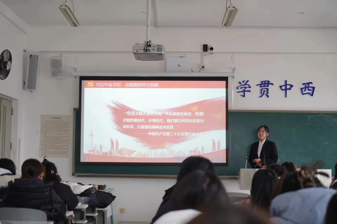 最后,宣讲团成员卢秀影同学以《守正创新担使命,行稳致远谱新章》为主题,讲到了“坚持守正创新”的理念。她从坚持守正创新所蕴含的三重逻辑展开,强调了当代青年要坚持守正创新,担负起青年使命,始终正确方向推进中国式现代化行稳致远,为中国特色社会主义做出贡献。
