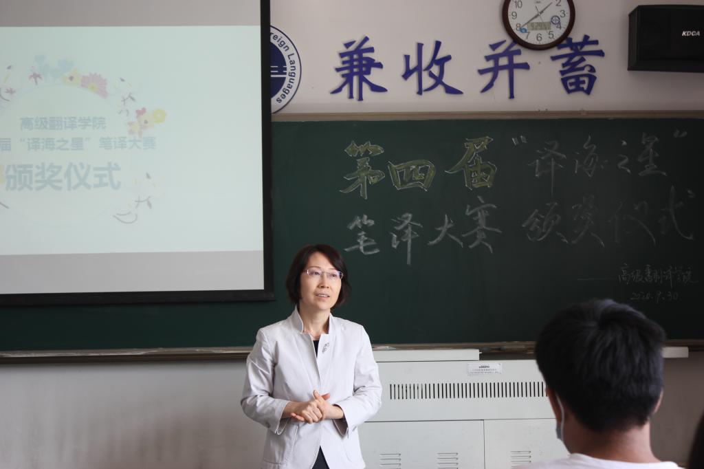 在颁奖仪式上,李春姬院长对获奖同学表示祝贺并做出点评。她肯定了选手们的精彩表现,并指出笔译贵在日复一日的坚持与积累,在进行日常翻译练习时要涉及多项领域,涵盖广泛内容,积累更丰富的笔译经验。此外,李院长向选手们提出殷切希望,她鼓励大家继续夯实笔译基本功,敢于参加更多专业比赛,努力成为一名高素质翻译人才。