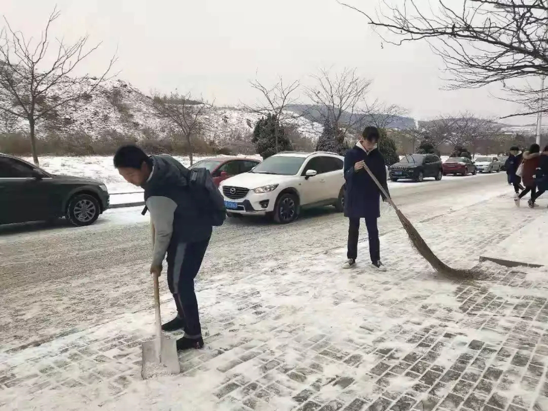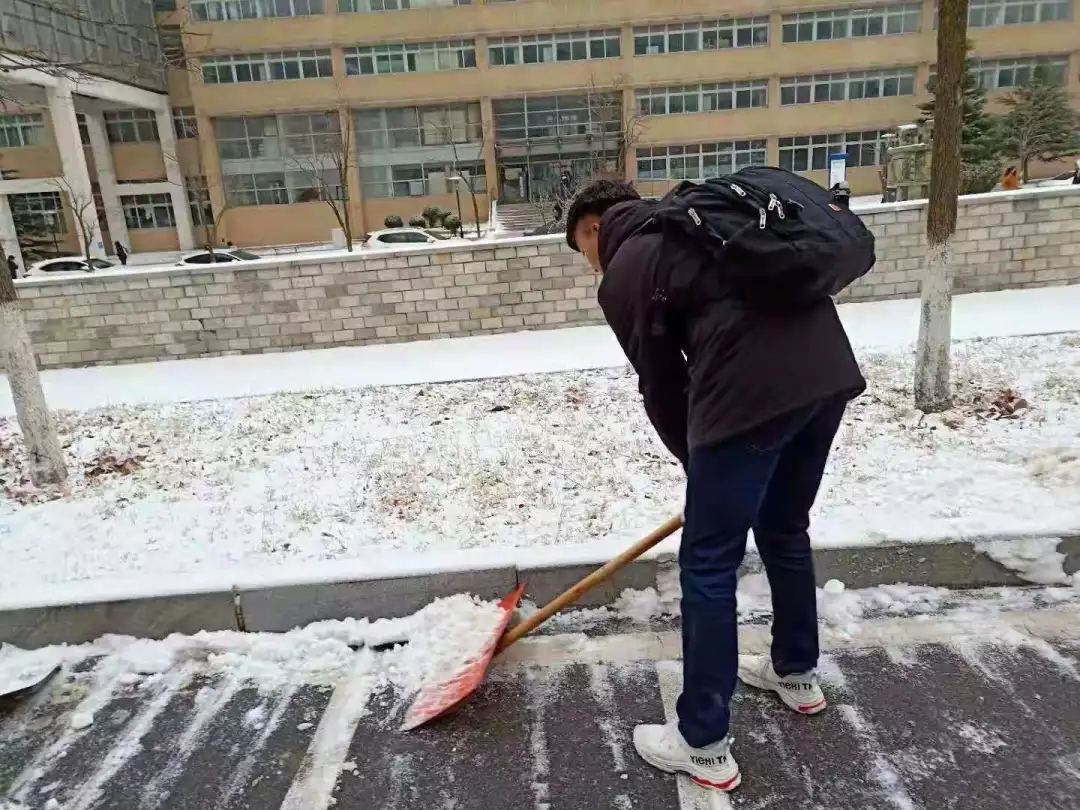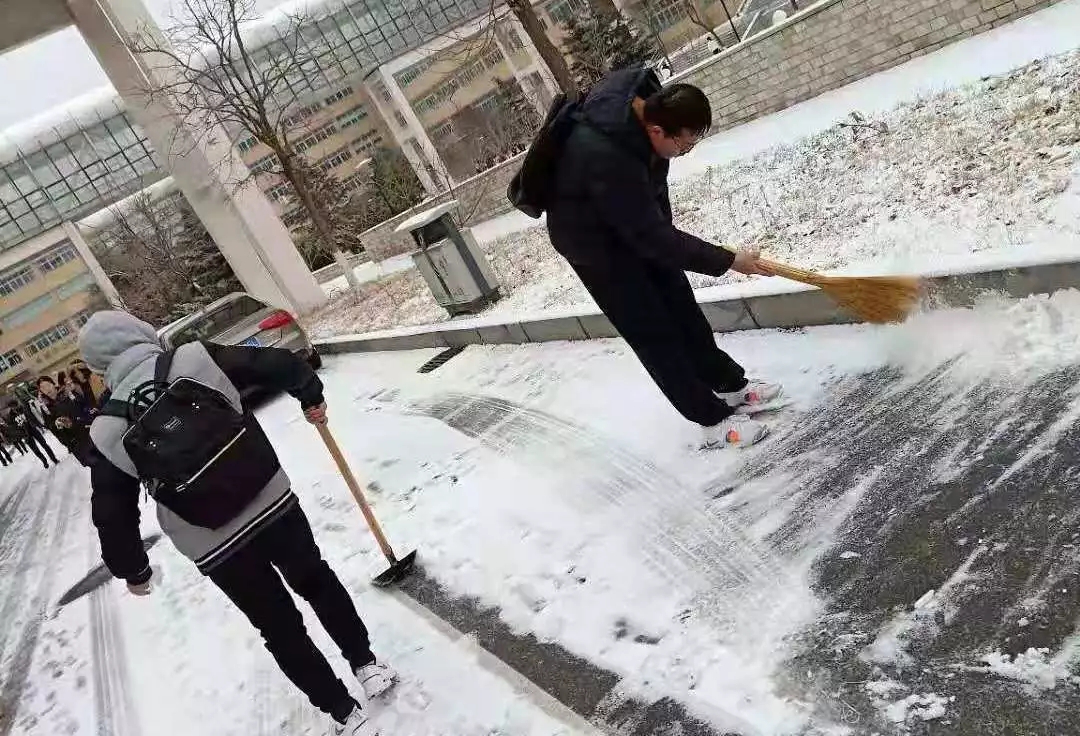 一夜的低温,使路面上的积水变成了寒冰,同学们很容易摔倒。前几日的积雪,已经在地面上被压实,更是难以清除,尤其是地砖铺就的部分,因为缝隙的存在而增加了除雪的难度。但是同学们仍以认真的态度与极大的耐心对待这项工作。大家分工明确,各司其职,以小铲子破除冻雪,以平铲和扫帚的将积雪聚拢,出色完成了工作。