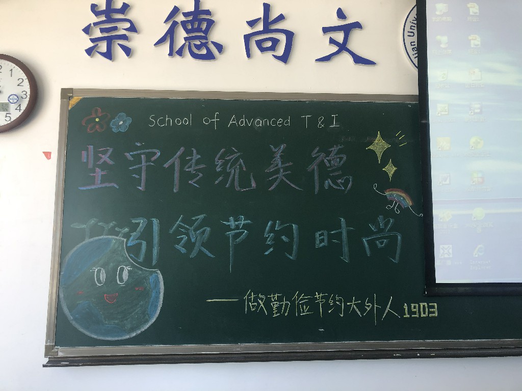 于励业楼6楼开展“坚守勤俭美德,引领节约时尚——做勤俭节约大外人”主题团日活动。本次活动由2018,2019级全体学生参加,旨在带领高翻学子发现生活中存在的浪费现象,感悟勤俭节约的重要性,厚植学院优良作风。