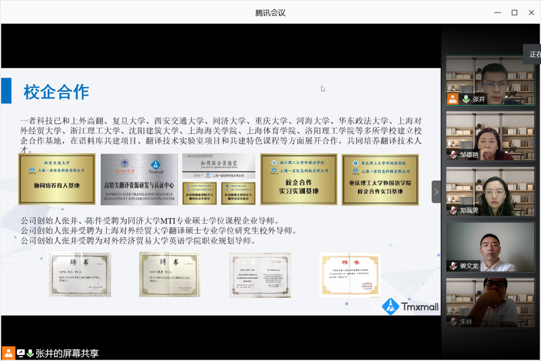 一者科技的张总首先对公司的尖端技术、校企合作经验进行介绍,并就双方的合作提出构想。上海一者信息科技有限公司是以自主研发技术为驱动的国家高新技术企业,作为行业领先的智能翻译与多语大数据解决方案提供商,目前已和国内多所高校建立深度合作关系,并计划通过YICAT在线翻译管理教学平台、多语种语料库的建立和实地实习交流三种方式培养适用的翻译人才。日前,公司承办的“腾讯TranSmart第三届全国机器翻译与译后编辑大赛”取得圆满成功。六色网