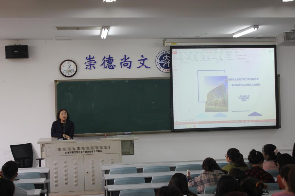副院长邹德艳主讲,2017级学生参加。邹院长以开放性的思维全面地介绍了真实翻译实践、翻译学术论文和模拟翻译实践三种翻译专业的毕业论文写作方向,并为论文选题提供了思路。