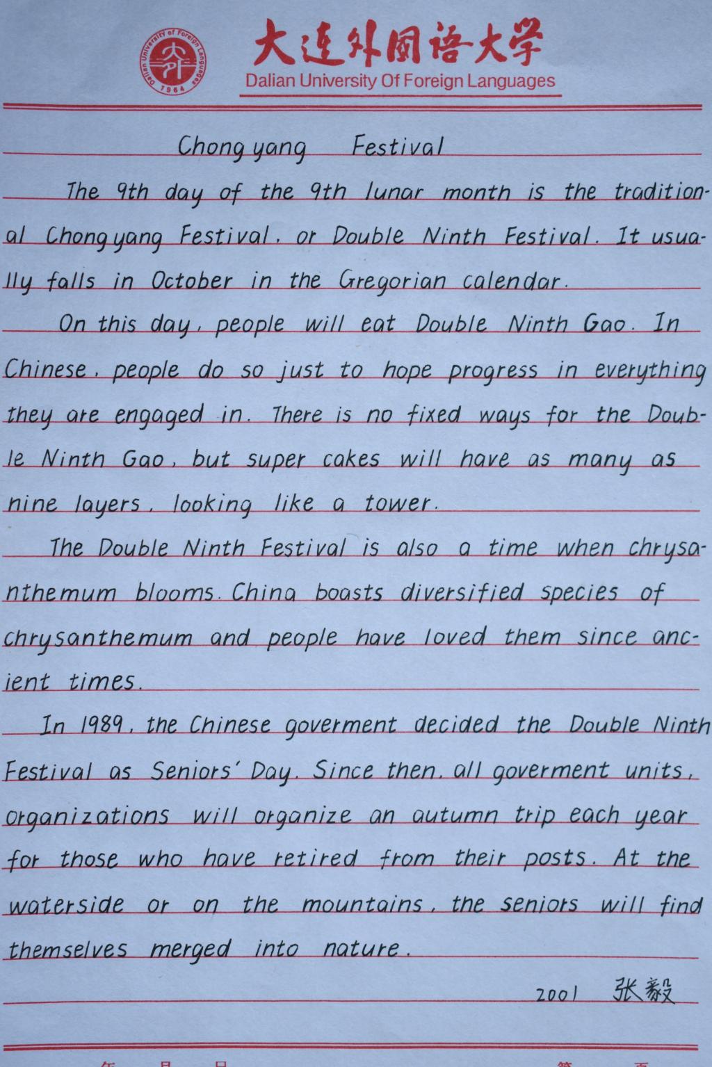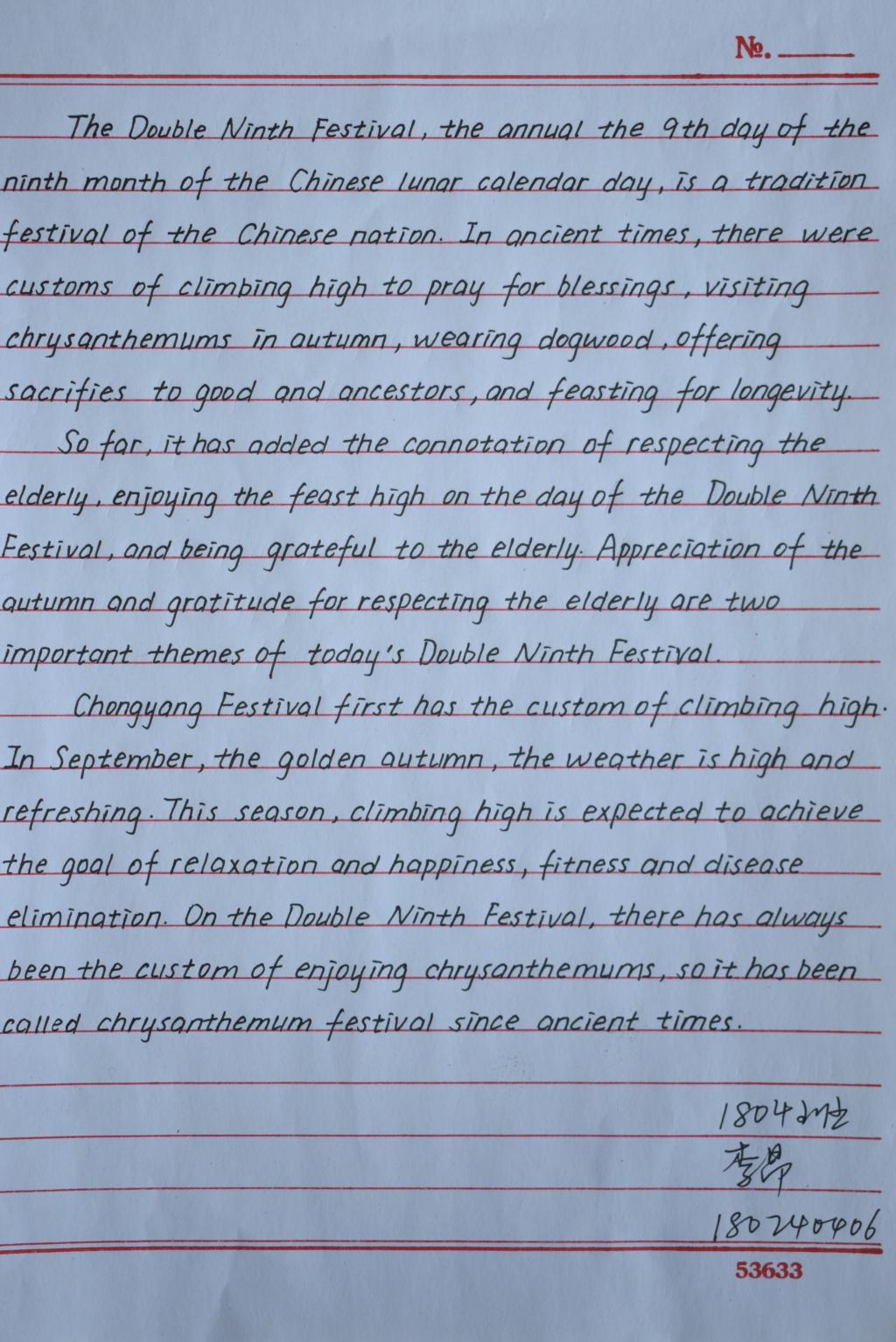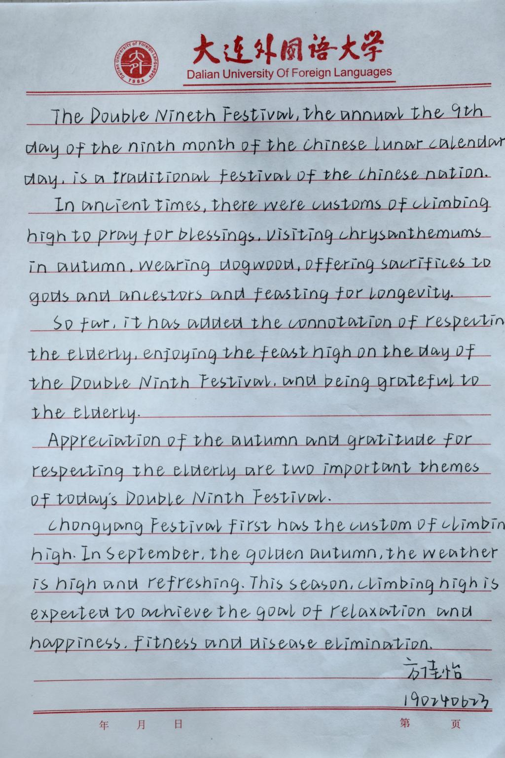 致力于全面培养学生的英语学习基本技能和内涵修养,紧跟中华民族伟大复兴的时代步伐,弘扬中华优秀传统文化,以重阳节为契机,延续传统,举办“第二届双语书法大赛”。本次比赛赋予了国学精华新的表达方式,带动了整个学院的“尚文之风”,增强了学院的学术氛围,提高了高翻学子对书法的兴趣,为学生日后生活与工作奠下了强有力的基础。
