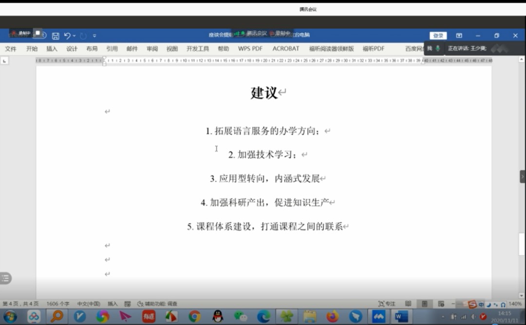 校优秀青年骨干教师、学院2018年引进的高层次人才王少爽老师结合自己近些年的科研工作经历,指出学院要努力拓展语言服务的办学方向、加强技术学习、强化科研产出、促进知识生产。王老师表示,学院应进行应用型转向、内涵式发展,建立一套完善的课程体系,打通课程之间的联系,提升建设层次和水平,输出高质量课程。