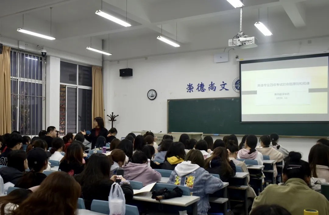 于11月18日下午在明德楼103教室举办了英语专业四级的命题原则和规律讲座。本次讲座由陈婧老师主讲,2019级学生参加。陈婧老师从专业四级考试的考核内容入手,对其命题原则、命题规律和解题思路进行了深入细致的讲解。