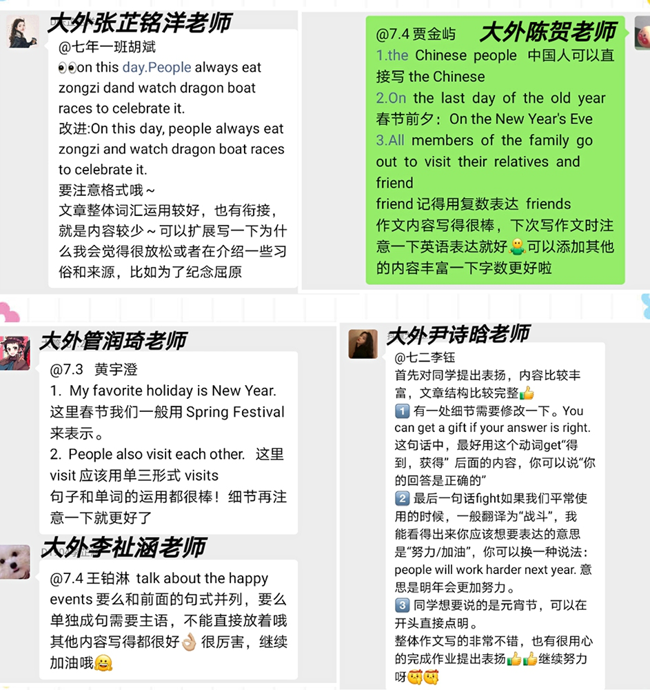 这次假期教学实践活动中,线上教学主要以第一课堂和第二课堂的形式呈现。第一课堂围绕英语的“听说读写”四个方面展开内容讲解,第二课堂主要以中西方文化差异普及、英语配音比赛两个方面展开。课上线上教学调动学生的积极性,课后团队成员与腰堡师生进行英语教学知识的交流和沟通,为同学们批改作文作业,帮助他们在学习上有更好的进步。在活动尾声,团队成员组织学生进行配音比赛,收获颇丰。