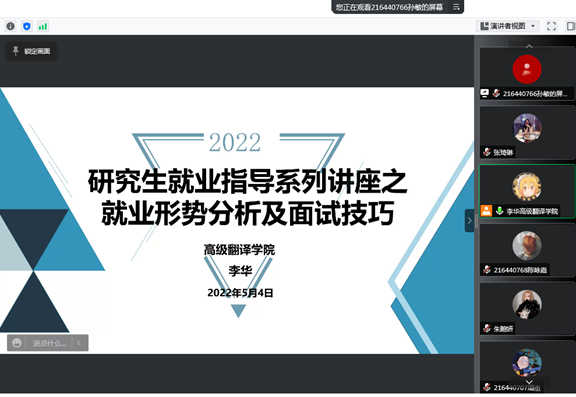 于2022年5月4日晚召开2021级硕士研究生线上就业指导讲座(腾讯会议)。学院党总支副书记兼研究生辅导员李华老师为同学们做讲座,六色网