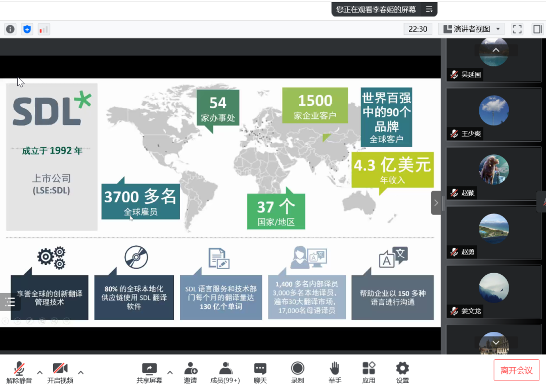 已有71名本科、硕士学生参加了实践基地的实习活动。一年两批为期六个月的翻译实习实践为高翻学院的同学们提供了充足的学习时间和实践体验机会。讲座中,李春姬院长还分享了几位参加此项目实习的学生的短视频及实习心得。他们一致认为,在RWS公司的实习使他们掌握了计算机辅助翻译工具的使用方法,了解了本地化翻译流程和工作内容,熟悉了翻译行业规范,在真实的翻译实践过程中进一步磨练了自己的翻译能力,为日后进入就业市场奠定了坚实的基础。