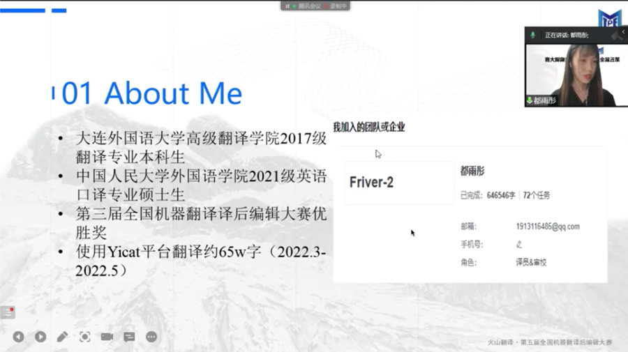在读本科生张芮菘同学曾在第四届全国机器翻译译后编辑大赛中获得三等奖,他分享了YiCAT平台的使用技巧、译文质量控制以及机器翻译对个人学习的影响。