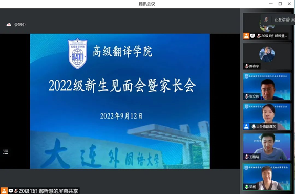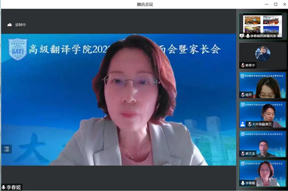 于线上召开2022级本科生新生见面会暨家长会,学院领导班子成员出席本次会议,2022级全体本科生及家长到场。会议首先由李春姬院长致辞。通过院长对学院整体概况、人才培养目标与教学理念以及翻译专业未来发展前景三个方面的介绍,新生及家长对学院教学水平与教学计划有了较为全面的了解。党总支书记姜文龙从学校与学院“为党育人、为国育才”的办学思想展开,鼓励新生强健体魄、陶冶心智,并就频发的电信诈骗事件对新生及家长进行了提醒。最后,班导师轮流发言,他们鼓励新生积极沟通,以期达成师生携手、教学相长的美好愿景。