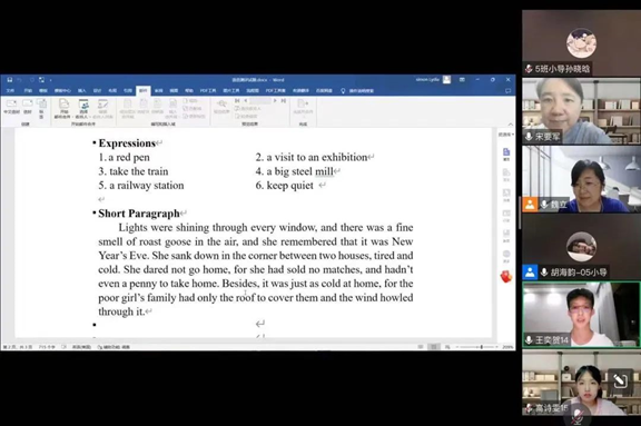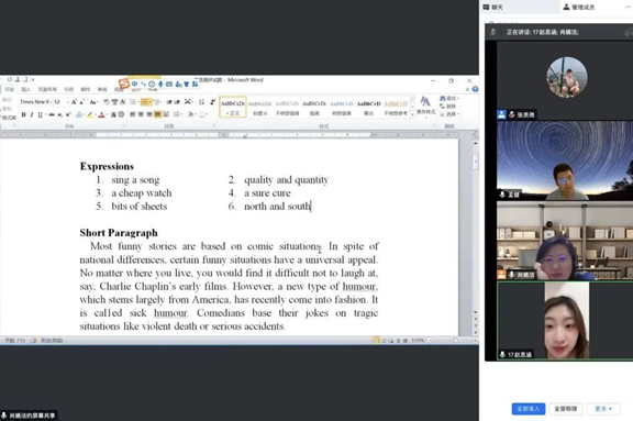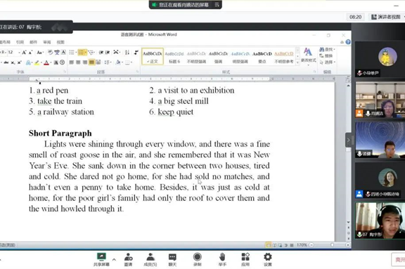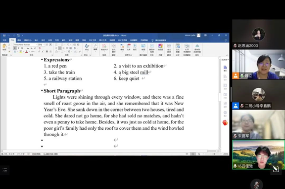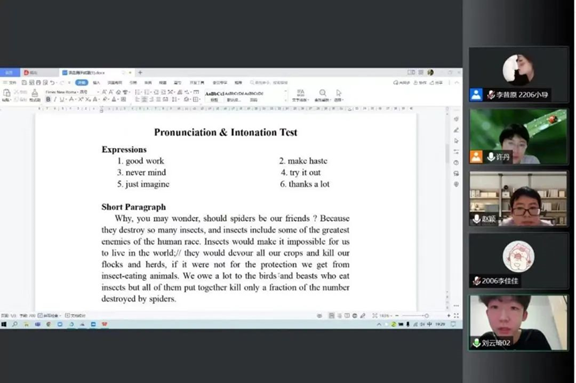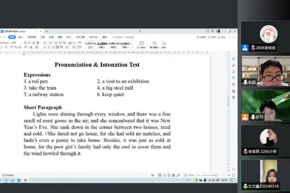 肖嬿洁、孟健、魏立、宋要军、许丹和赵颖老师。高翻2022级共173名新生参加了本次测评。测评采用腾讯会议平台,分两个场次进行。在各班班导生的协助下,语音测评活动有序开展。同学们按照学号依次进入会议,进行英语短语和语段的朗读。