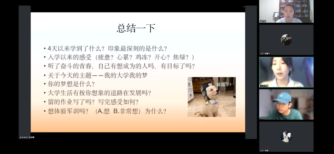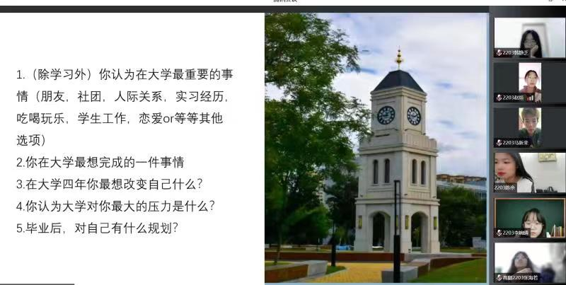 也迎来了2022级的小萌新们。随着新生入学教育的完美落幕,小萌新们也对自己即将踏入的大学和专业有了一定的了解。线上授课在即,为了帮助同学们更好地适应大学生活,9月16日下午3时,班导生们给新生召开了“我的大学我的梦”主题班会,让我们一起来看看大家都聊了些什么内容吧!