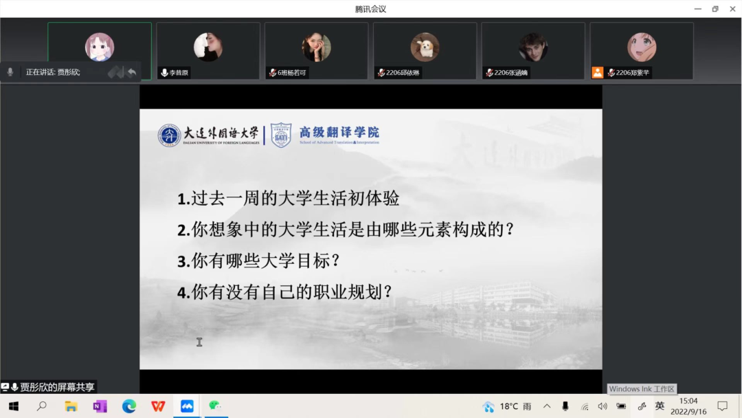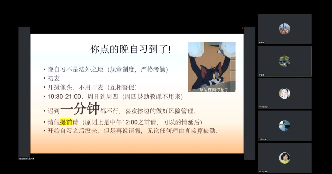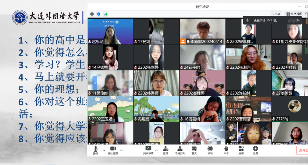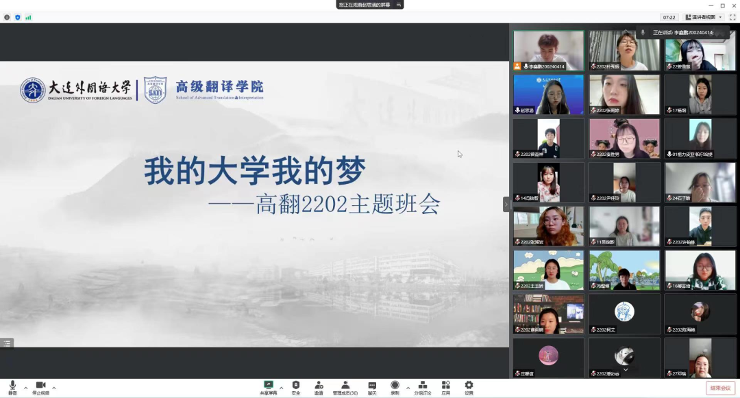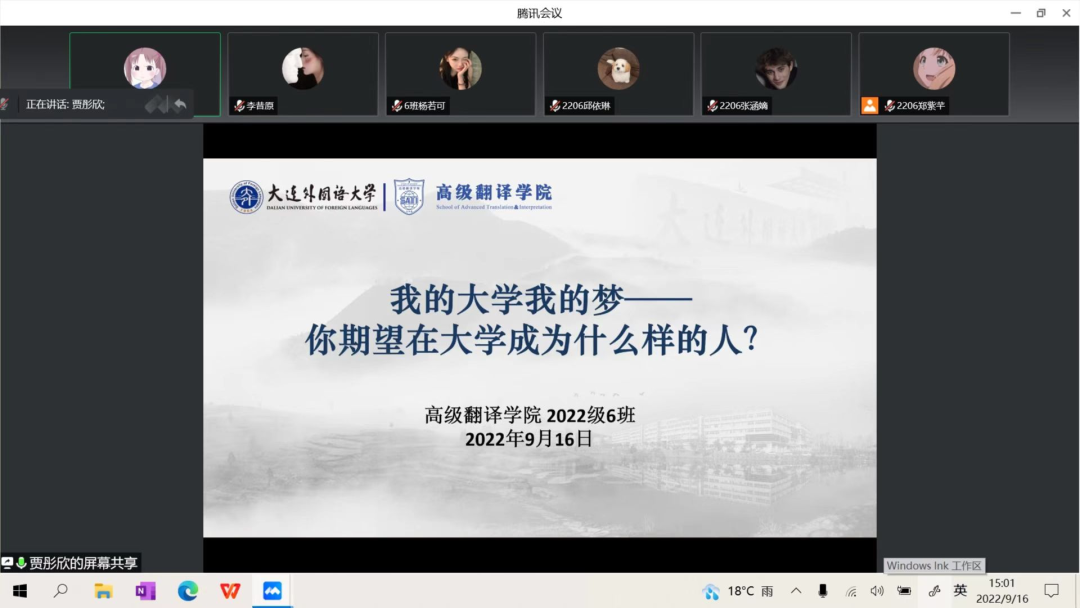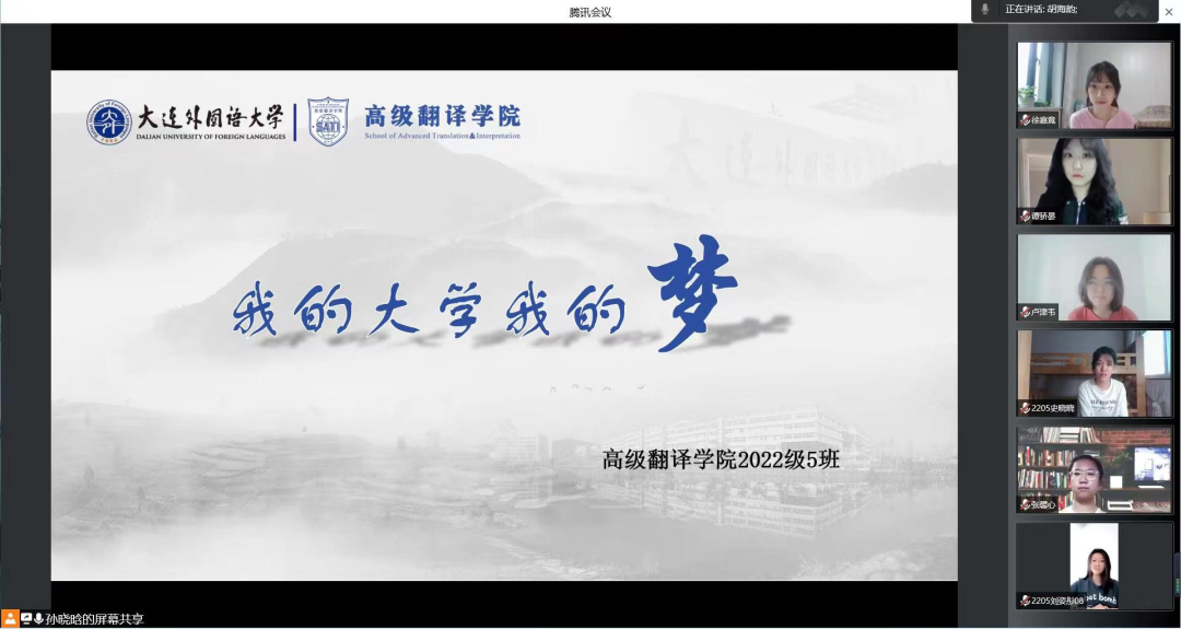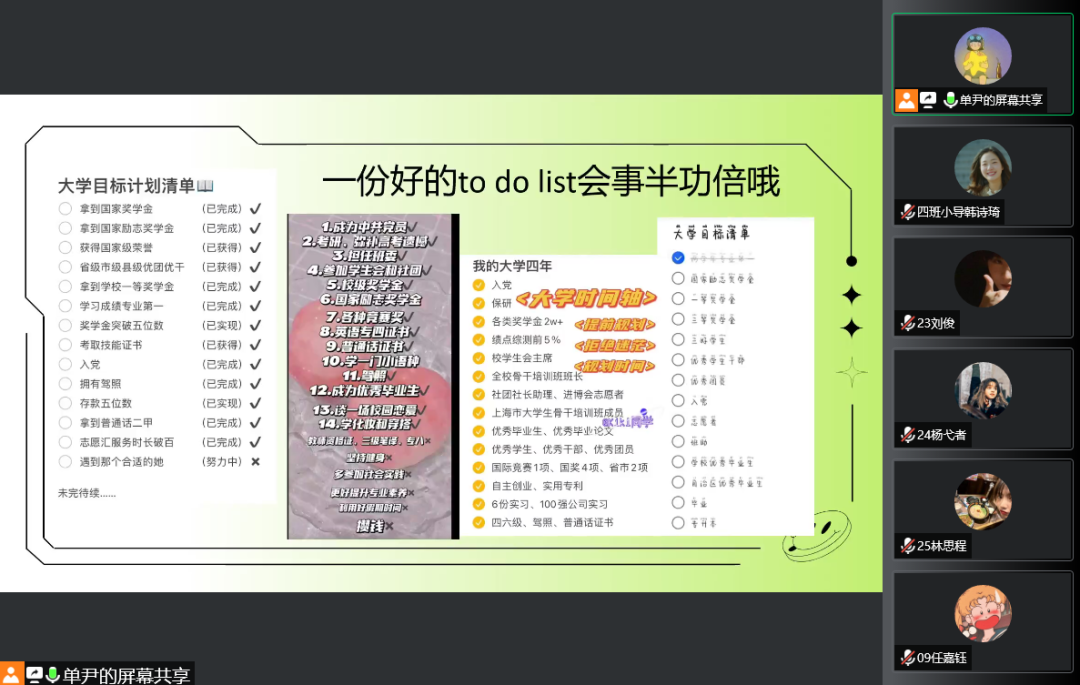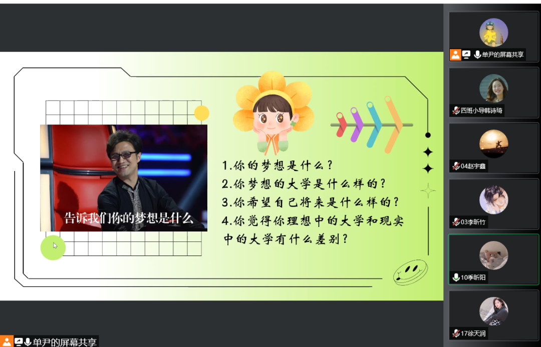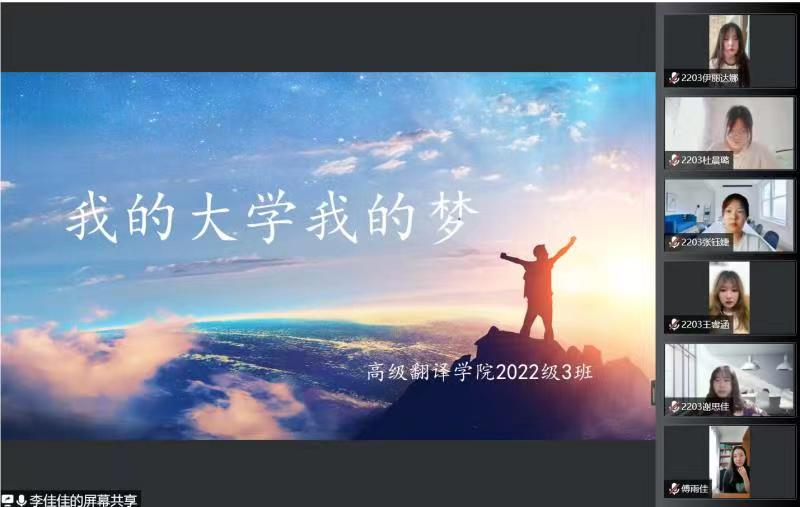 在班会上,各位同学分享了自己的梦想以及自己对大学的期待,大家也一起讨论了对于翻译这个专业的看法。随后,班导生们带着各位同学一起做了大学的目标清单,以帮助同学们在大学中更有奋斗的目标。最后,班导生还给同学们讲了许多线上授课的注意事项,祝愿同学们能在日常学习生活中感受到翻译的魅力所在。