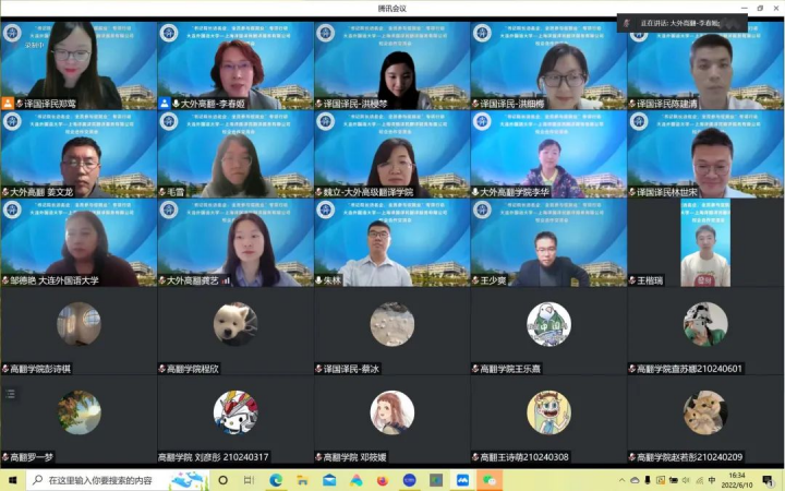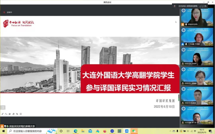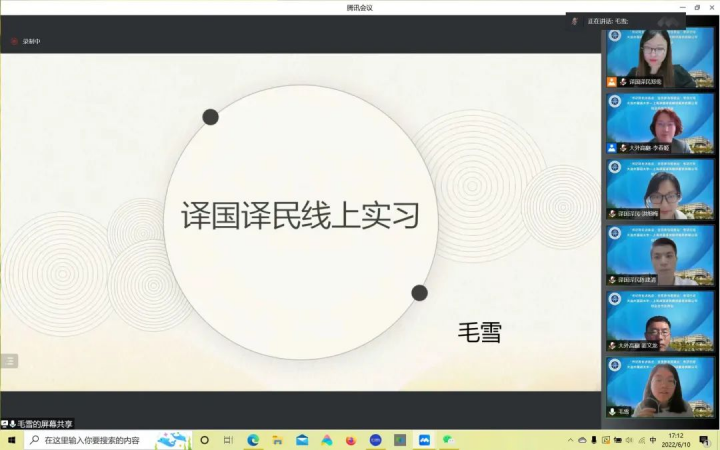 2021年寒假线上实习生代表毛雪也分别就高翻学院参与译国译民大赛情况及线上实习情况作汇报发言。洪梫琴女士指出,译国译民集团在承办了多种省级与国家级的翻译大赛的同时也自主办赛,六色网