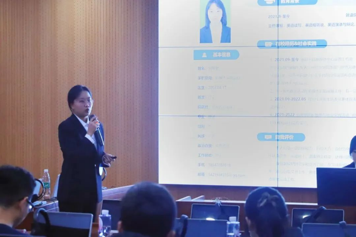 本次比赛共分为演讲答辩及压力面试和评委讲评两个环节。在演讲答辩阶段,七位选手充分运用霍兰德职业分析报告,MBTI人格类型测试,WVI职业价值观测评等理论工具,结合基本简历,工作实践经验,以及对未来的发展规划等内容分析与探索了求职方向。选手们轮流展示,逻辑清晰、表达得体,凸显了独到的个人理解与岗位认知。压力面试阶段,评委老师根据当前就业形势以及选手演讲答辩的内容提问选手,测试选手们的抗压能力与应变能力。选手们应对问题神色自若,沉着镇静,对答如流。比赛中场休息阶段,为确保比赛公平公正,评委们共同讨论确定评分规则,为选手表现进行打分。整场比赛中,工作人员协调有序完成各项工作,展现了高翻学子蓬勃的精神面貌。