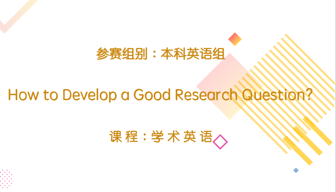 方菊老师的交流作品《如何构建一个好的研究问题》(How To Develop a Good Research Question?),设计巧妙、创意新颖,获得了专家评委的认可,最终获得二等奖。