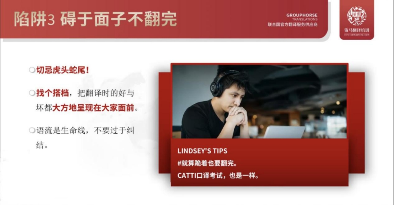 随后Lindsey老师讲述了一些考场“陷阱”,提出了具体又实用的建议。在口译考试时,面对容易被干扰的情况,需要寻找自己的节奏,在练习时也要杜绝干扰源;不要心存侥幸,避免被同桌影响;切忌虎头蛇尾不翻译完;在考试时需要找到自己的声音,避免音量越来越大,在练习时也要养成录音与听自己录音的习惯。