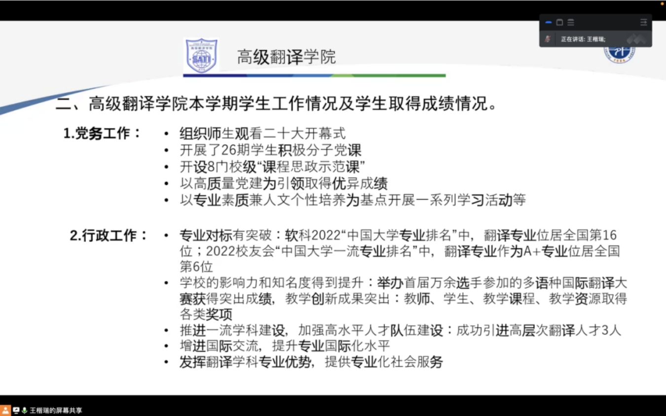 于线上召开了2022级家长会。本次会议由学生辅导员龚艺老师主讲,主要围绕学校重要通知及相关内容、本学期学生情况,以及学生未来发展路径及往届学生就业情况三大部分。首先,龚艺老师针对学校校纪校规部分重点内容、预防网络诈骗、大学生参军入伍政策宣传、假期学生安全、身心健康等内容进行宣传讲解,并针对家长们关心的学校资助政策、医保等内容进行了解答。其次,龚艺老师介绍了本学期2022级学生们的获奖情况,目前展现出来的特点及存在的问题,以及下一步的培养重点。最后龚艺老师介绍了学生们毕业后的多元选择,从保研、考研、就业、出国等多个方面,结合往届毕业生的就业情况,帮助家长们了解高翻学子可以选择的未来发展路径,呼吁家校合力,共同助力学生们成长成才。