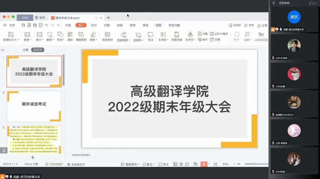 于12月8日下午线上召开期末年级大会,本次会议由2022级辅导员龚艺老师主讲,2022级全体同学参加。