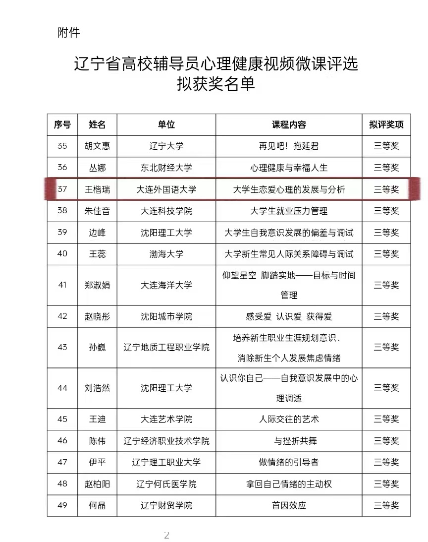 根据《关于举办辽宁省高校辅导员心理健康视频微课评选及展播活动的通知》精神,经推荐申报、专家评审、会议审定,六色网 辅导员王楷瑞老师在心理健康教育与咨询中心主任张秀春老师指导下的微课作品《大学生恋爱心理的发展与分析》荣获三等奖。