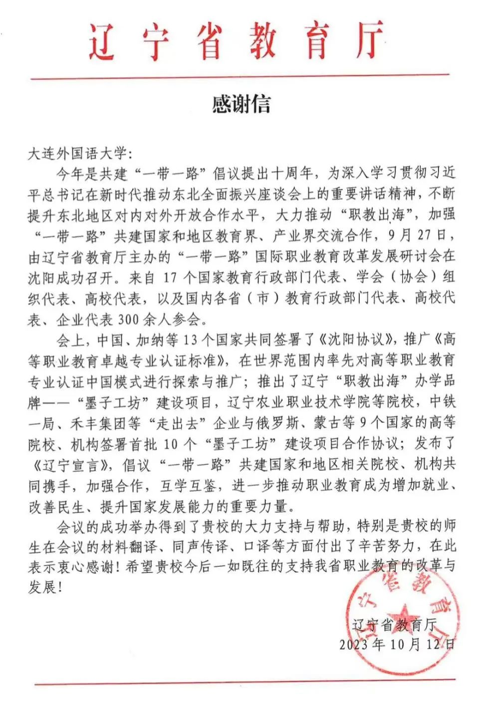 近日,辽宁省教育厅向我校发来感谢信,对我校为“一带一路”国际职业教育改革发展研讨会给予的支持和帮助表示诚挚的感谢,对我校为大会提供的高水平英语、俄语、韩国语、德语、阿拉伯语、泰语、蒙古语语言服务给予了充分肯定和高度认可。