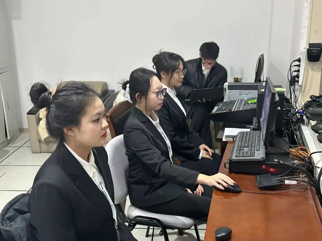 比赛现场精彩不断。台上,主持人张弛有度、大气磅礴,选手们镇定自若、游刃有余。台下,工作人员恪尽职守,备品组、算分组、机动组注重细节,认真备品、紧张计分、沉着控场;管理组组织选手们签到、抽签及流程引导,他们始终耐心细致,认真管理选手并为各位选手提供力所能及的帮助;礼仪组细心指引选手、嘉宾入场候场,力求提供最优质的志愿服务;技术组认真调试设备及进行技术切换,确保比赛的完美进行,使聚光灯下流光溢彩。追光而遇,沐光前行,台前精彩,幕后生动,每个认真工作的志愿者都是大赛中不可或缺的光点。
