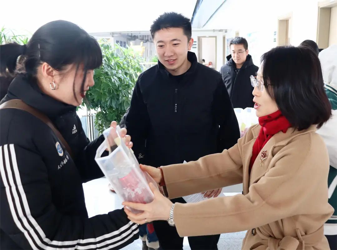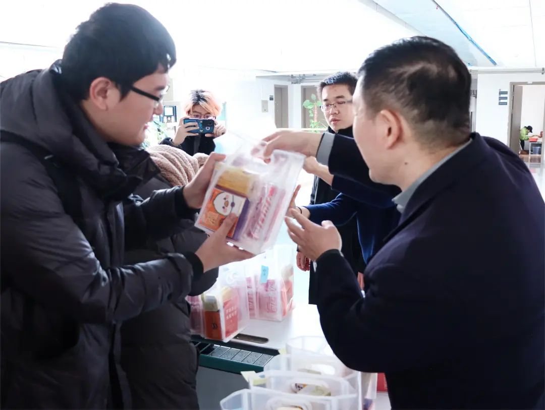 于12月19日组织开展考研慰问活动。学院党总支书记姜文龙、院长李春姬、党总支副书记兼研究生辅导员李华、副院长王少爽、辅导员龚艺和王楷瑞为学院2024届考研学生送去亲切慰问与“金榜题名”暖心助考礼包。