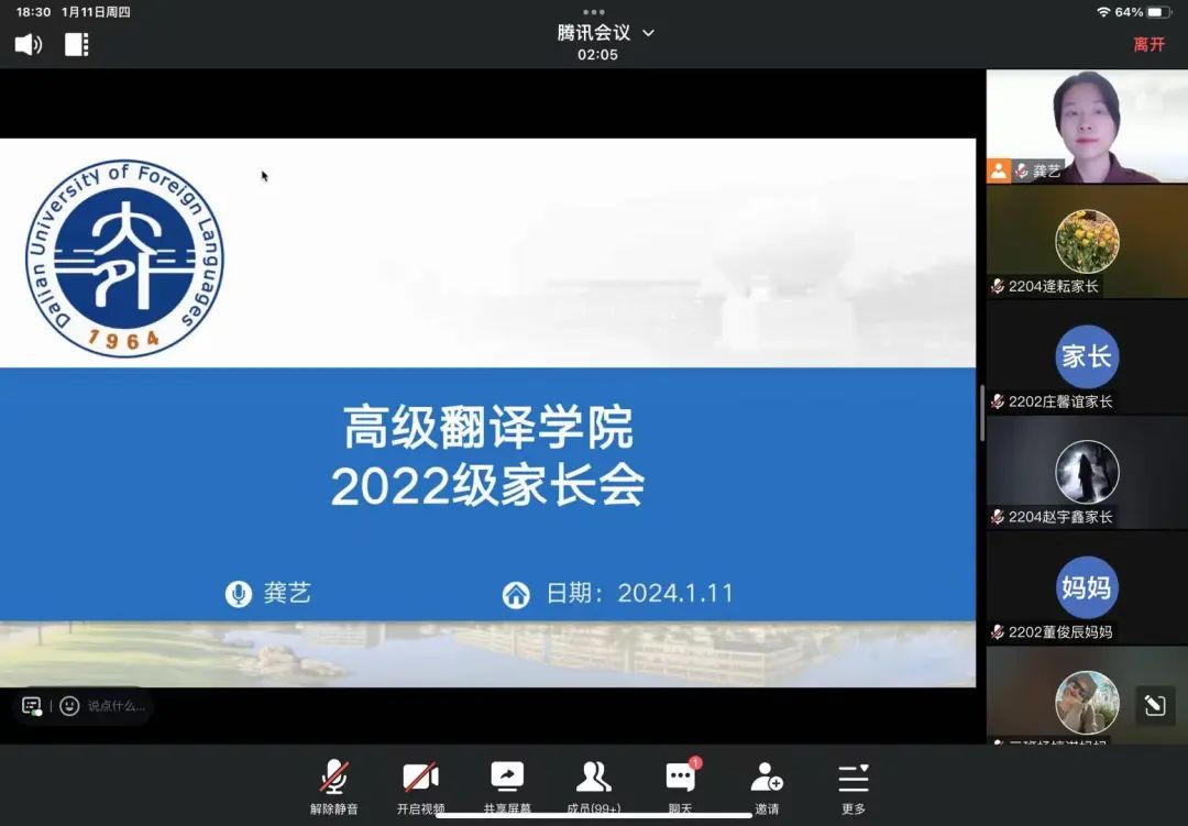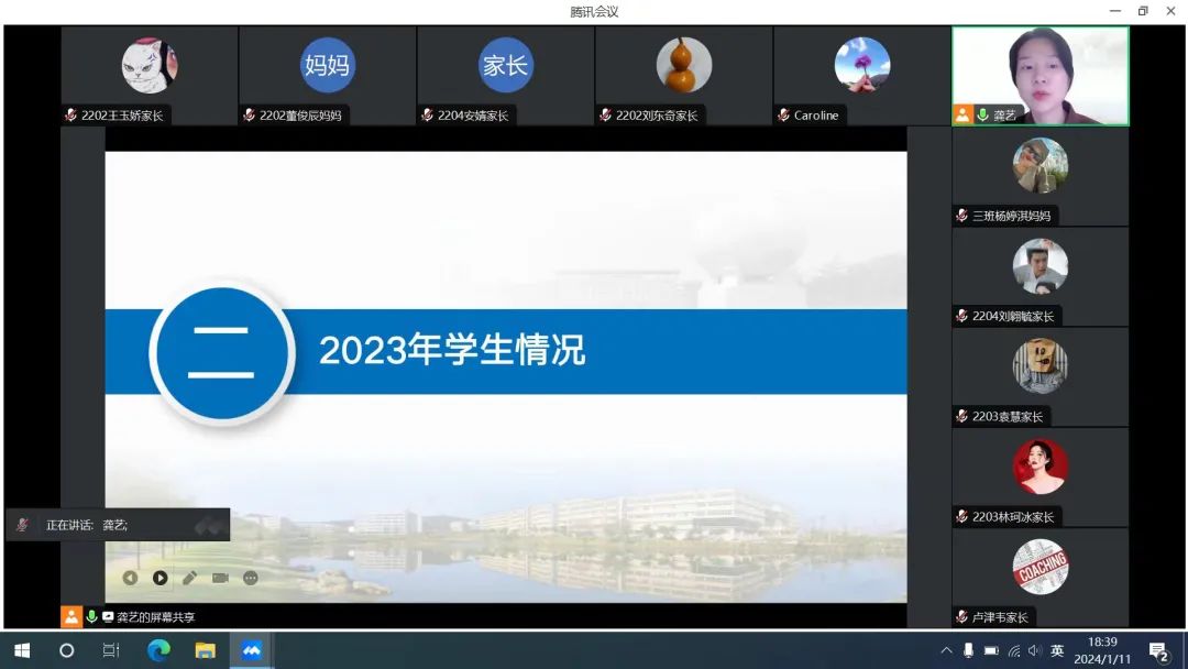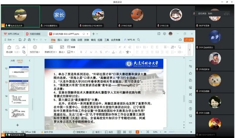 在2022级家长会上,龚艺老师首先介绍了学校相关重要通知,解答了家长们关心的问题。其次,龚老师介绍了2023年同学们在学习成绩、学生工作、比赛活动等各个方面的表现和取得的成绩,也介绍了今年学院的各类精彩活动。最后,龚老师结合翻译专业往年就业情况对学生毕业方向进行了全面的分析。龚老师总结,希望家长不仅要关注孩子的学习,更要关注他们的身心健康及综合素质能力培养,同时希望形成家校合力,共同助力学生成长成才。