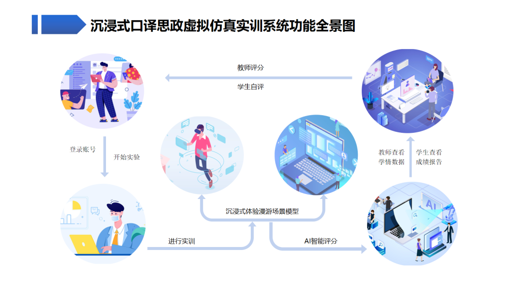 虚拟仿真口笔译实训中心”的软硬件设施,集合虚拟现实与人工智能技术,采用3D全景构建口译仿真场景,赋能联络口译教与学,提高学生的临场应变能力、口译实战能力和综合素质。同时,该教学系统有机融入课程思政元素,旨在落实立德树人根本任务,助力学院一流学科专业建设,促进学校高质量发展。