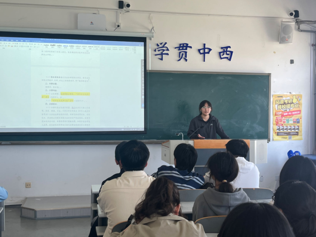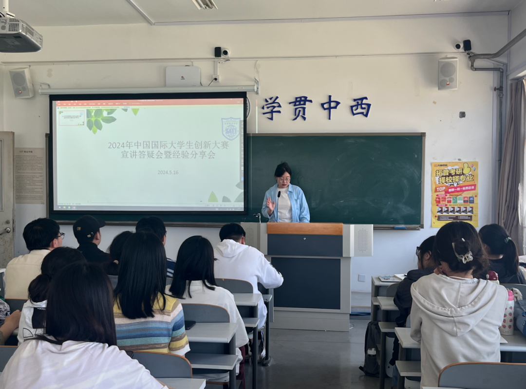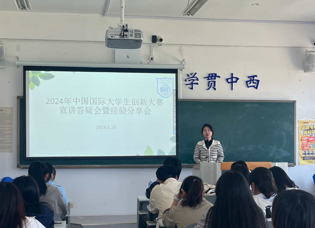 首先,龚老师结合《关于举办中国国际大学生创新大赛(2024)校赛的通知》文件,从赛事内容、选拔比例、赛事意义三个方面为同学们详细介绍了相关信息。龚老师表示,通过参加创新大赛,同学们能够将理论知识与实践创新相结合,还能够锻炼团队协作和解决问题的能力,鼓励同学们积极参加,充实丰富自己的大学生活和个人履历。
