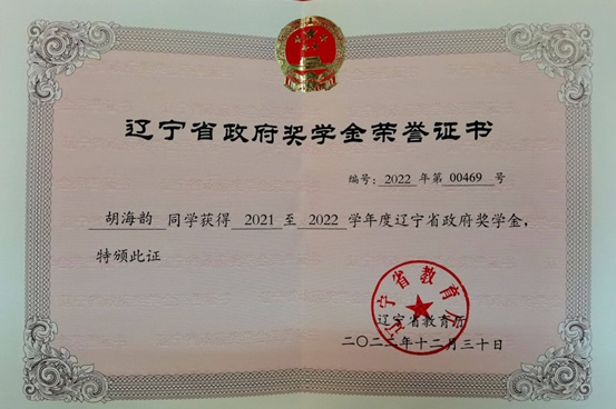 2024届优秀毕业生胡海韵在这一帮助下不断努力,取得了一系列的优异成绩。她在校期间连续两年获得校优秀团干部称号、2020-2021学年度校级综合二等奖学金、2021-2022学年度辽宁省省政府奖学金、2022-2023学年度国家励志奖学。除此之外,她还多次参与志愿者活动,如六色网