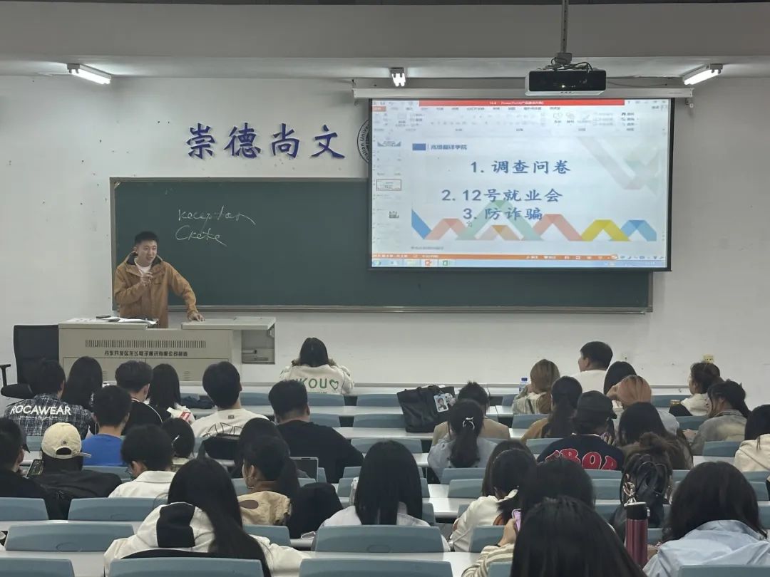 在大会中,王楷瑞老师结合往年就业信息详细的介绍了2024届毕业生去向,带领大家填写调查问卷,并对同学们的未来规划提出了建议,他分别从考研方向、面试技巧、职业规划等多个方面为学生们提供了指导。此外,王老师呼吁同学们要积极参与12号的就业招聘会,提前了解就业市场。他强调,就业招聘会是连接学生与职场的桥梁,是大家直接接触企业、了解行业动态、把握就业机遇的宝贵平台。最后王老师也强调,同学们在日常生活中一定要加强安全意识,时刻注意保护自己的人身和财产安全。