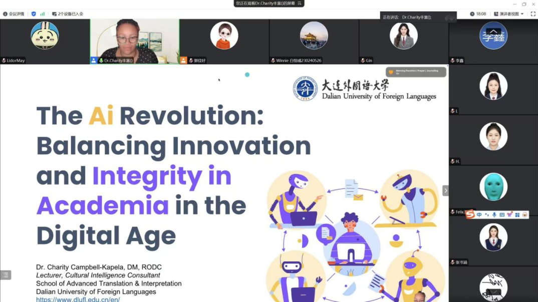 于11月7日举办了题为"人工智能应用与学术伦理"的线上讲座。此次讲座由学院外籍教师Charity C. Campbell博士主讲,是学院获批辽宁省首批翻译专业虚拟教研室后的一项重要活动。