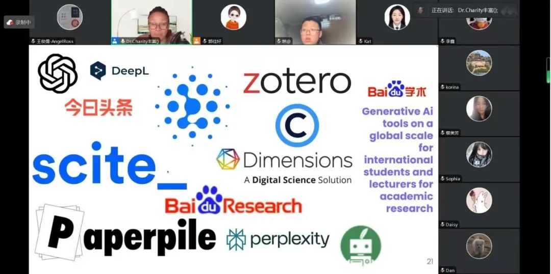 在讲座的准备阶段,Campbell博士与大家热情互动,调动同学情绪,确保大家能及时进入状态。讲座开始后,Campbell博士带领同学们探讨了AI在研究、写作和学习中的有效应用。在这之后,她强调了同学们应学习如何平衡AI的使用与伦理原则以及如何检测和避免AI驱动的来袭,让AI成为帮助大家学习语言的有力工具。讲座尾声,Campbell博士向同学们生动地演示了如何将AI技术融入课堂教学,并带领同学们一起体验了当下流行的AI工具。