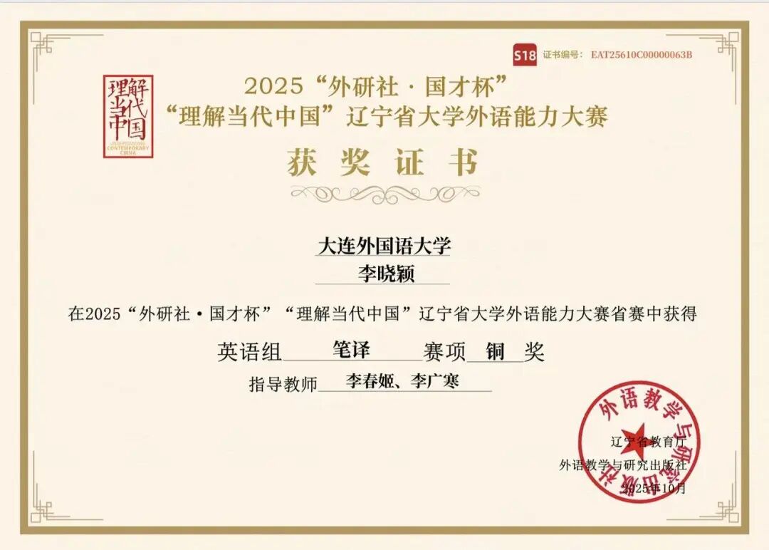 2025年10月25日,2025“外研社·国才杯”“理解当代中国”全国大学生外语能力大赛英语组笔译赛项于线上成功举办。高翻学子在激烈竞争中表现卓越,25级研究生温宝玲、22级本科生卢津韦同学荣获银奖,25级研究生李晓颖同学斩获铜奖,充分展现了扎实的语言功底与精湛的笔译技艺。