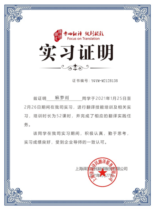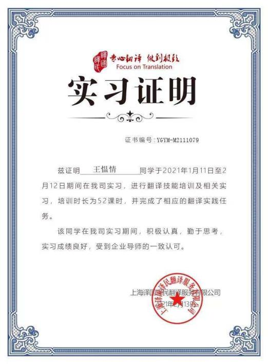 总的来讲,译国译民对于我来说是一份宝贵的实习经历,它让我在寒假期间每天有规律地学习,充实自己,也给我提供了一个非常好的实习平台,让我学习到了很多翻译技巧和策略,更深入地了解语言服务行业,实习后拿到一份不错的实习证明,也可以为以后的简历增添光彩。更重要的是,通过这次课程的学习和直播中各位优秀老师的讲解,也让我对未来的职业有了比较清晰的规划。