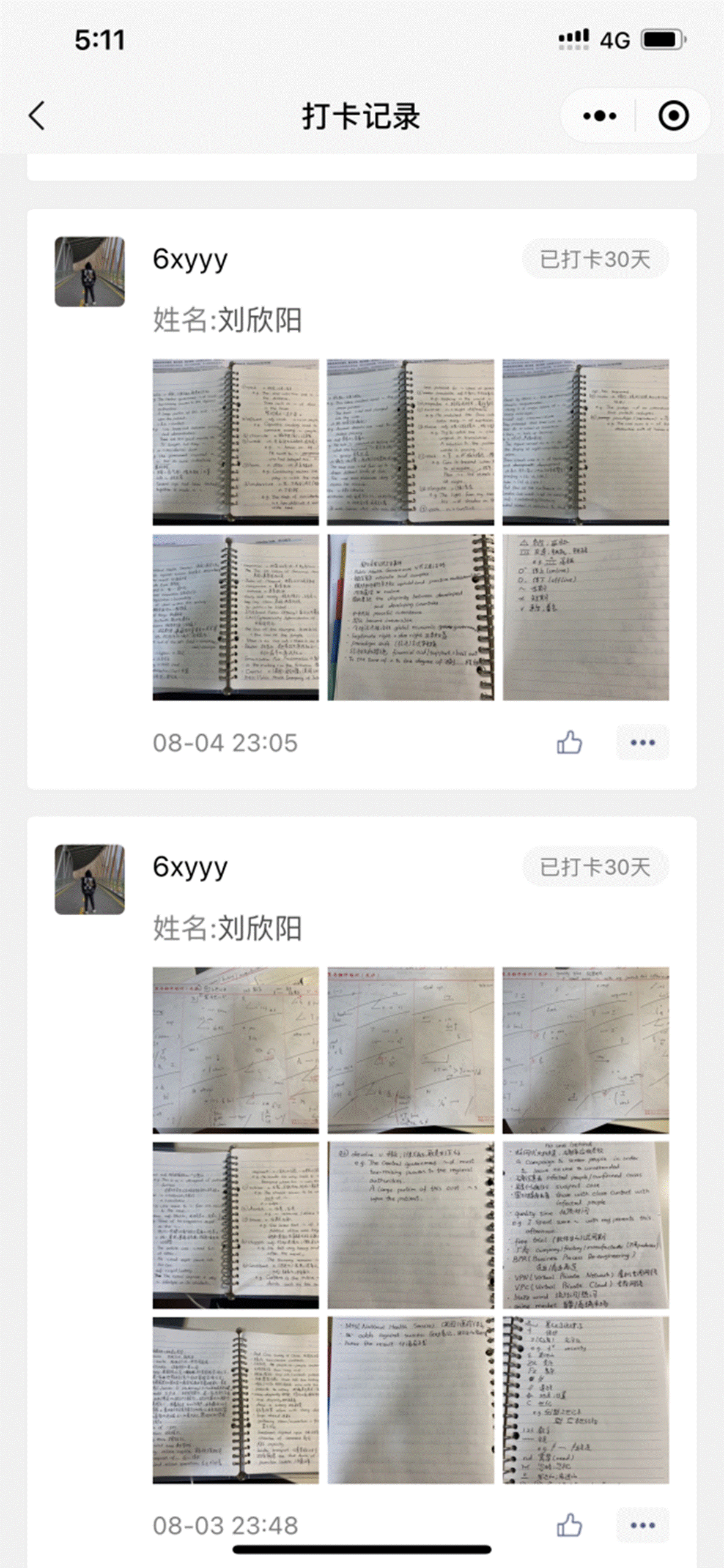 21天可以养成一个好习惯,这个暑假我坚持打卡,力求培养出良好的英语学习习惯。因为大二将要面临专四考试,所以我将每日学习的侧重点放在了dictation练习、单词积累和外刊阅读上,以提高自身的听力水平、写作能力,并且扩充词汇量。感谢高翻逐梦人活动让我度过了一段充实且美好的假期时光!