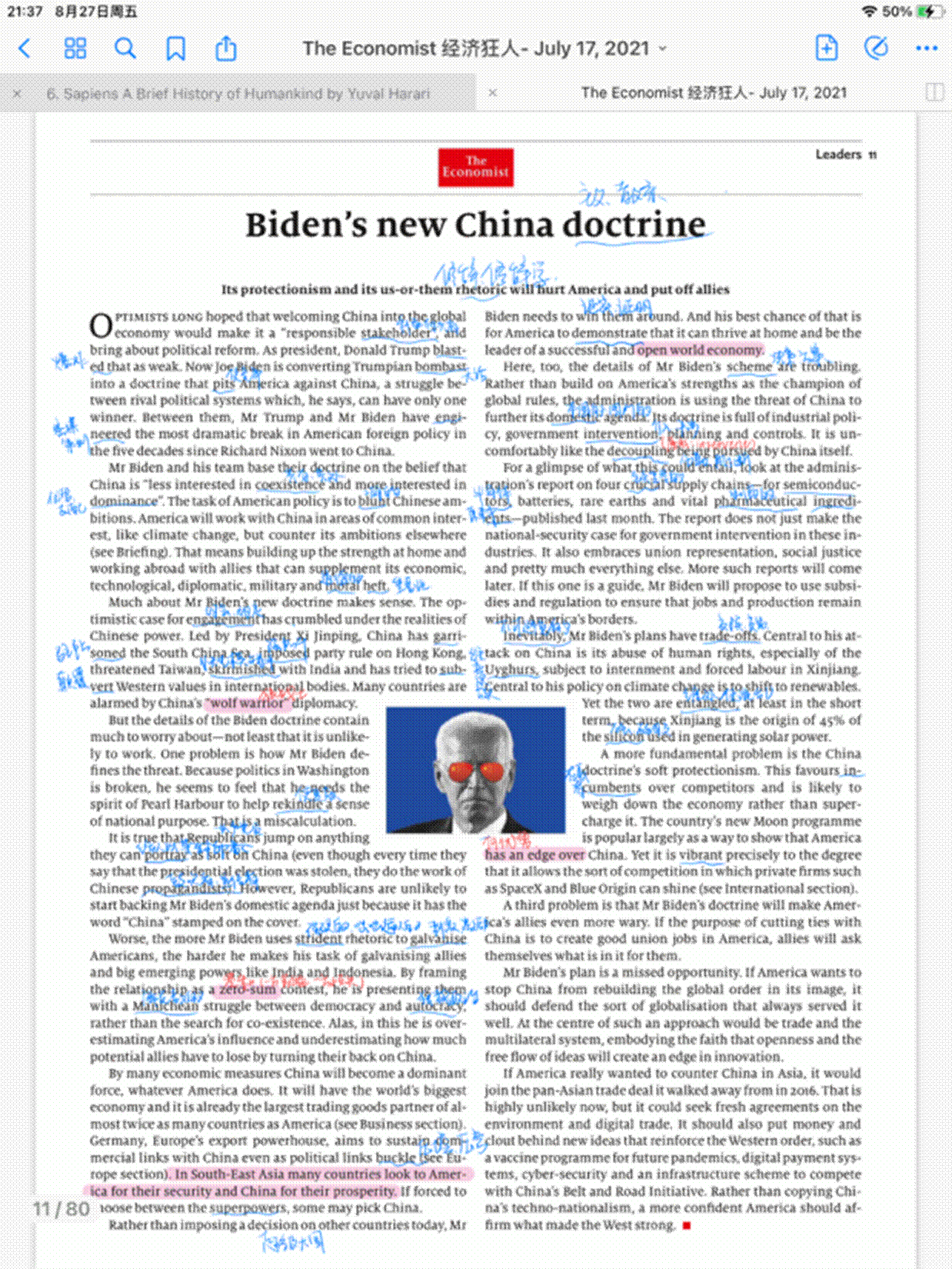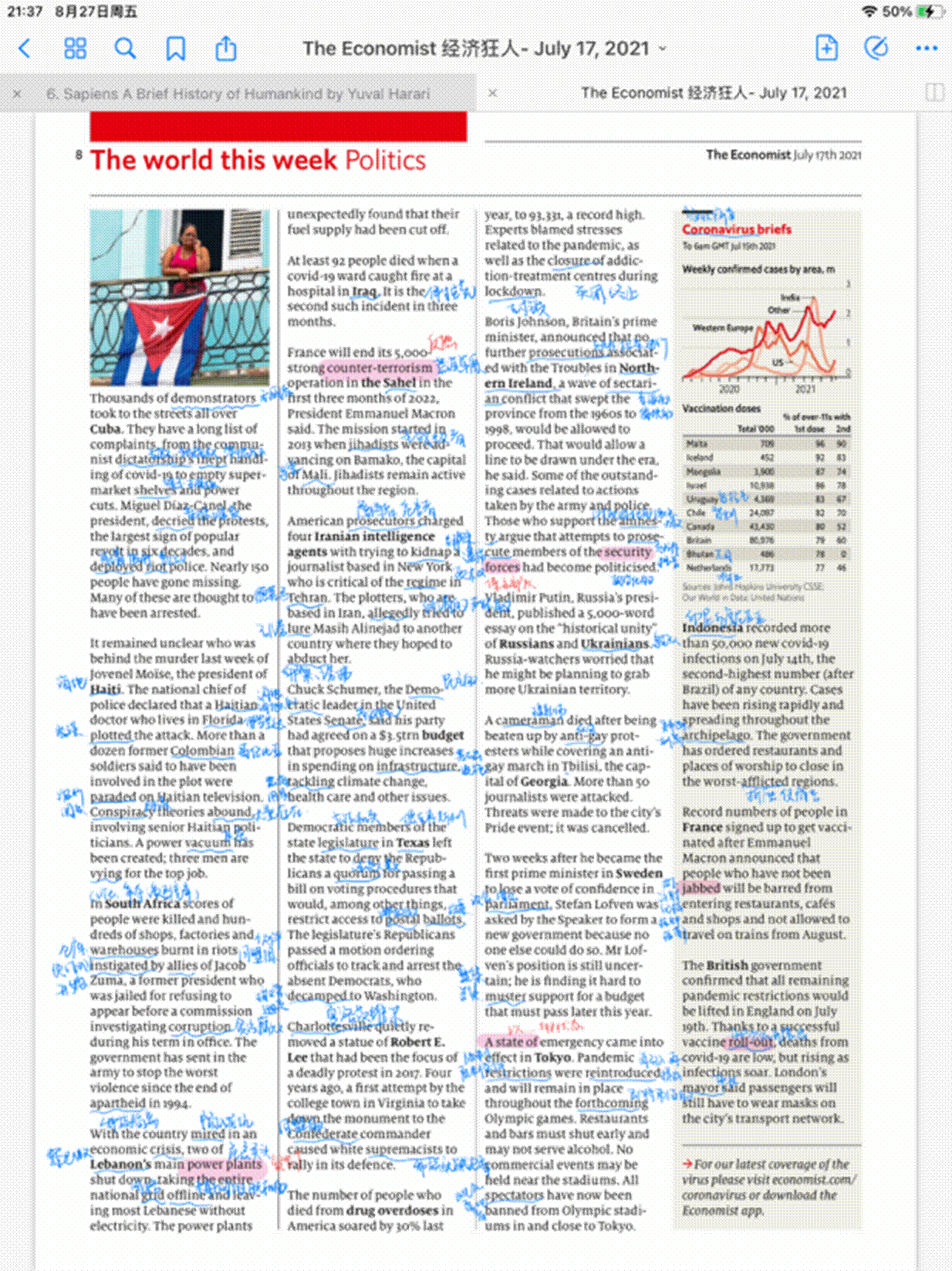 在假期过程中我进行了外刊的精读,因为阅读外刊可以增加对地道外语表达的了解,对英语专业的我们来说还是很有必要的。我还在一个公众号中学习了笔译词汇等英语相关知识,我觉得用处很大,推荐给大家。