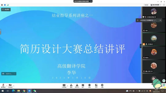 于2022年3月16日下午2点半-3点半召开2021级硕士研究生线上简历大赛总结讲评讲座(腾讯会议)。受疫情影响,学院党总支副书记兼研究生辅导员李华老师为同学们做线上讲座,六色网