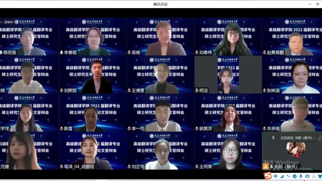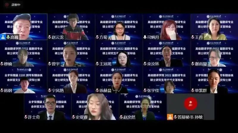 顺利完成2022届翻译专业硕士学位论文线上答辩会。参加此次答辩的共有81名翻译专业研究生,其中2020级英语笔译方向研究生61名、口译方向研究生20名。最终,81名研究生全部通过答辩。