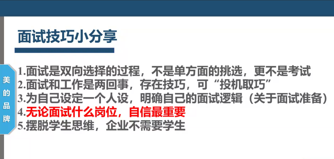 在本次活动中,吴一鸣同学以他在美的楼宇科技的工作经历为主题向同学们传授了他的实习经验。他建议同学们在考研和就业的选择上充分思考,在面对就业问题时不要局限于专业,可以结合自身特长选出最适合自己的职业。他还称实习是非常有必要的,实习可以帮助自身充分积累经验。在选择实习岗位时,要结合自己的职业规划,多积累面试技巧,最重要的是无论面试什么岗位,一定要展示出自己自信的一面。最后,吴一鸣同学向同学们介绍了他在美的的工作以及日常,并且鼓励同学们在学习之余找到一个适合自己的业余活动,劳逸结合。