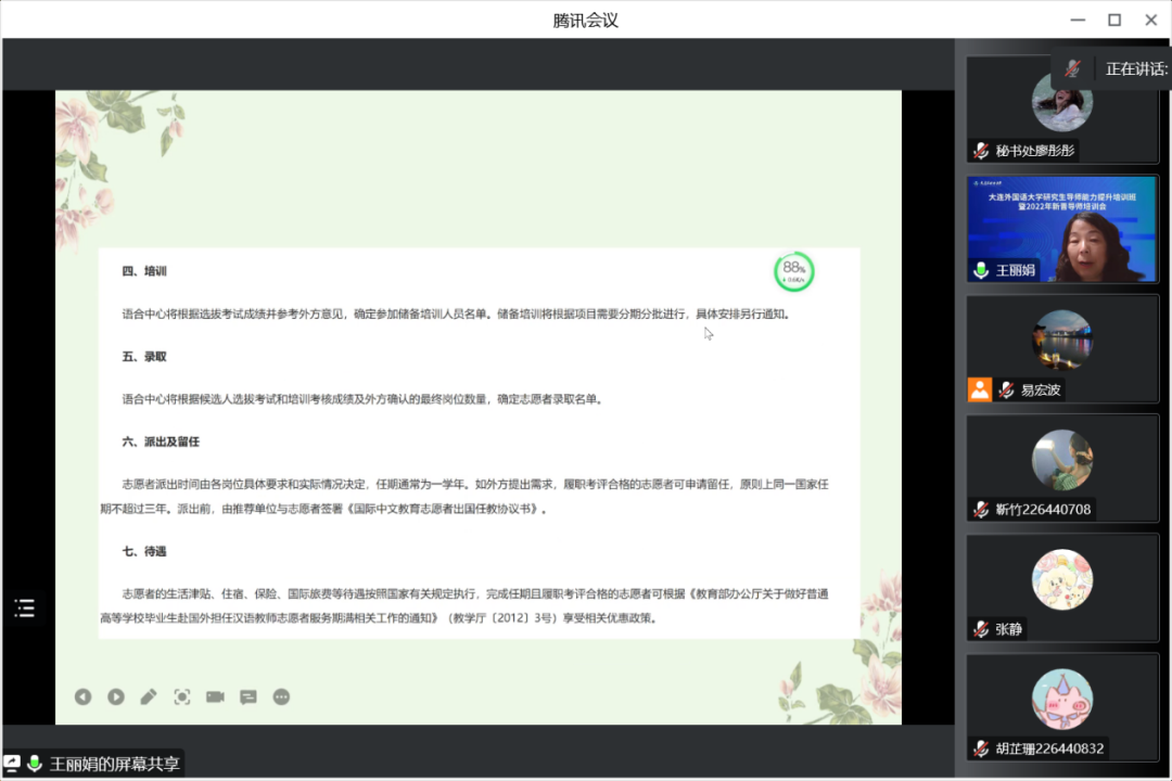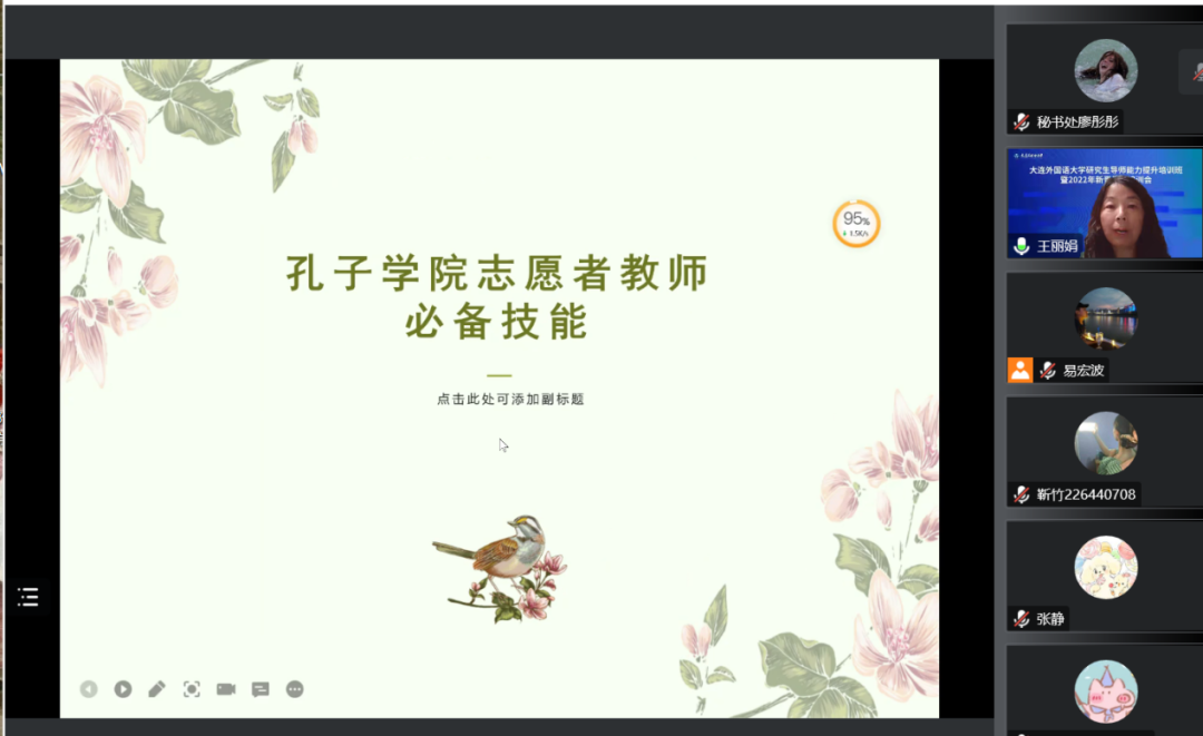 于云端召开了孔子学院志愿者教师必备技能讲解会。本次会议由王丽娟老师主讲,学生志愿者们齐聚云端,共同参加会议。