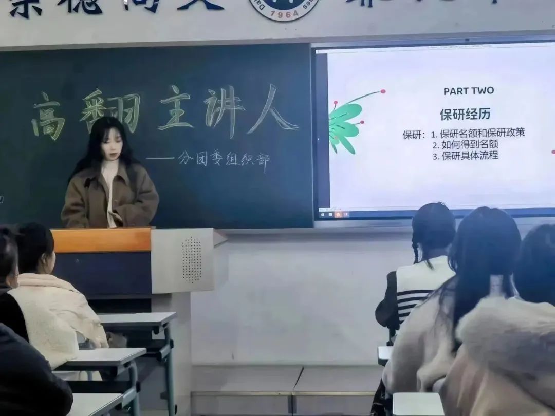 时隔一年再度迎来线下高翻主讲人。本次活动在励业楼B区613教室举行,邀请到了刘馨茹同学作为主讲人,她以“如何学好英语及保研经验分享”为主题,向同学们进行了宣讲。