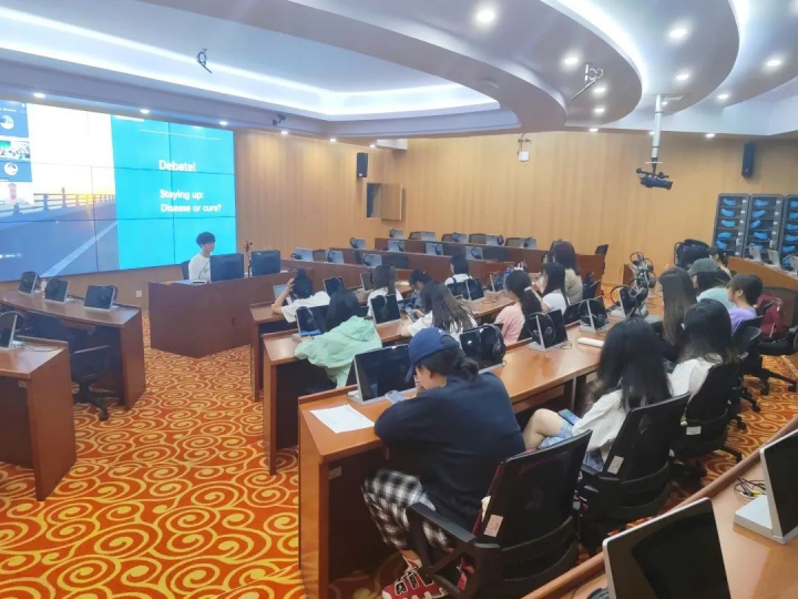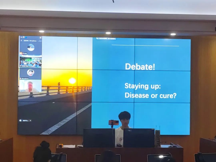 在励业楼5楼虚拟仿真口笔译实训中心顺利举办了本学期最后一次英语角活动,邀请了外教Daniel通过腾讯会议出席。本期英语角以“Staying up: Disease or Cure”为主题,鼓励同学们讨论熬夜的利弊,思考健康高效的生活方式。