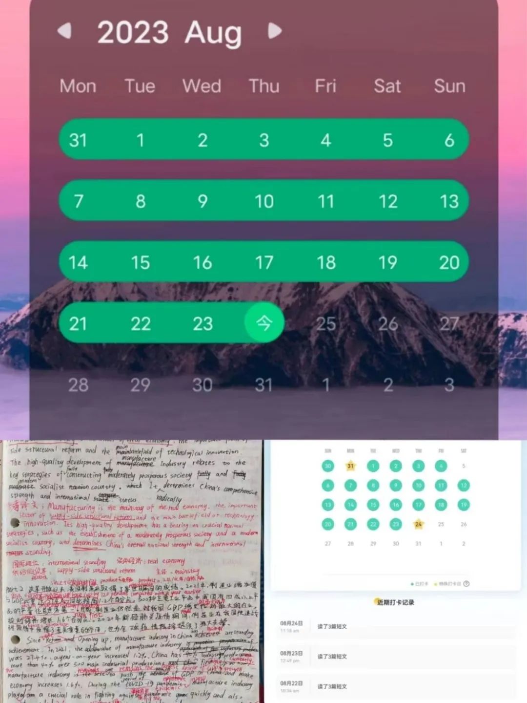 这个假期里看了一些名著,例如《杀死一只知更鸟》,看了部分英文原版,摘抄学习了一些生词,同时为了更好的理解,也观看了同名电影。为了加强听力,进行了许多篇专四听写练习,听着之后认真对照原文更改。假期也去做了一些CATTI考试相关模拟练习题,做题的同时进行了词汇积累,语法总结。除此之外,也在坚持背专四单词,增强自己的单词基础,为以后的学习做更好的铺垫。学习贵在坚持,持之以恒,打卡活动于我而言也是一种很好的自我激励,相信我们能够在不断的坚持之中,离梦想越来越近!