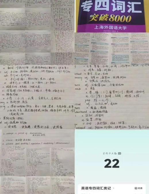 当然冰冻三尺非一日之寒,滴水穿石非一日之功,虽然我确实坚持进行了一段时间的打卡,但想要把之前未完成的专四词汇全部背完还是不现实的。按照每天50个词的速度也仍然需要一个多月时间才能做到全盘结束,而巩固复习又是不可忽视的,所以背单词这个看似小的事也会让我有长路漫漫的感觉。