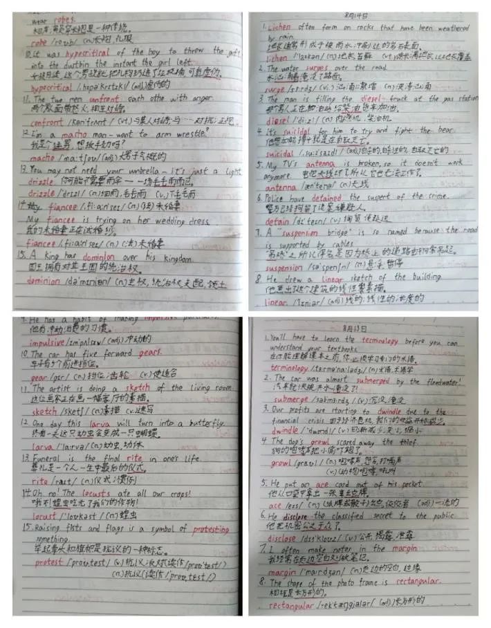 学习是需要循序渐进的,学院的日常打卡活动其实也是在激励大家每天都要进步一点,让量变促成质变。在暑假期间,我每天坚持背诵专四单词,不断复习旧的,学习新的,从而为专四考试打下基础。养成习惯后,背单词不再是一件难事。同时我也在精读《双城记》《纸牌屋》等外语名著,做好笔记,掌握了很多词汇,也慢慢学会梳理长句,阅读能力显著提升。